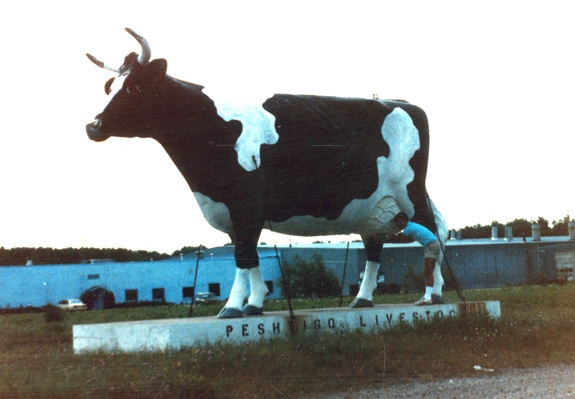 UPDATE: Darren tells me the cow was put there by his grandfather, former Peshtigo Mayor Henry Drees. Sadly, for those of you who logged into on Orbitz frantically trying to book flights to Peshtigo to see the cow, well, the roadside bovine is long gone.