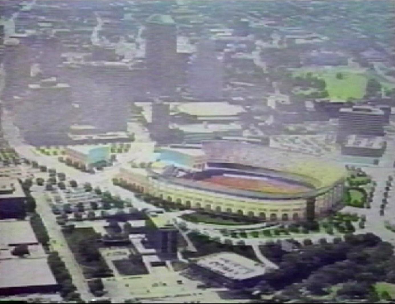 Yes, that is an NFL stadium pictured in the Downtown North neighborhood of Hartford.  Not the one New England Patriots owner Bob Kraft said he was bringing his team to in 1998, (that was over in Adriaen’s Landing) but rather a coliseum inspired football field to host the Los Angeles Rams, Los Angeles Raiders or any team that wanted to move  Connecticut’s capital city.
