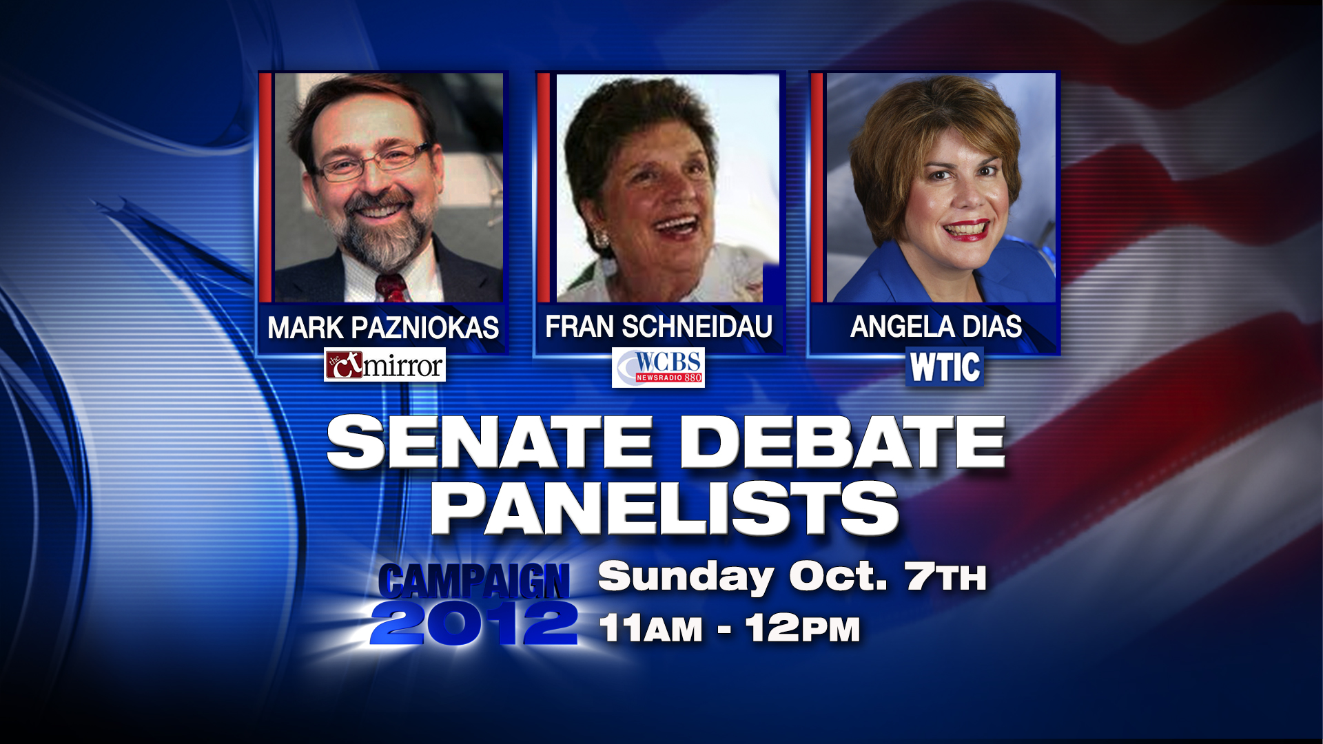The Channel 3 Eyewitness News senate debate will be held at 11AM in our Face the State studio.     I will be serving as moderator, and here are our three panelists.