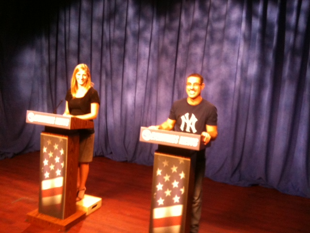 WFSB’s Allison Annino and Tony Meliso standing in for McMahon and Murphy during debate preparations on Friday